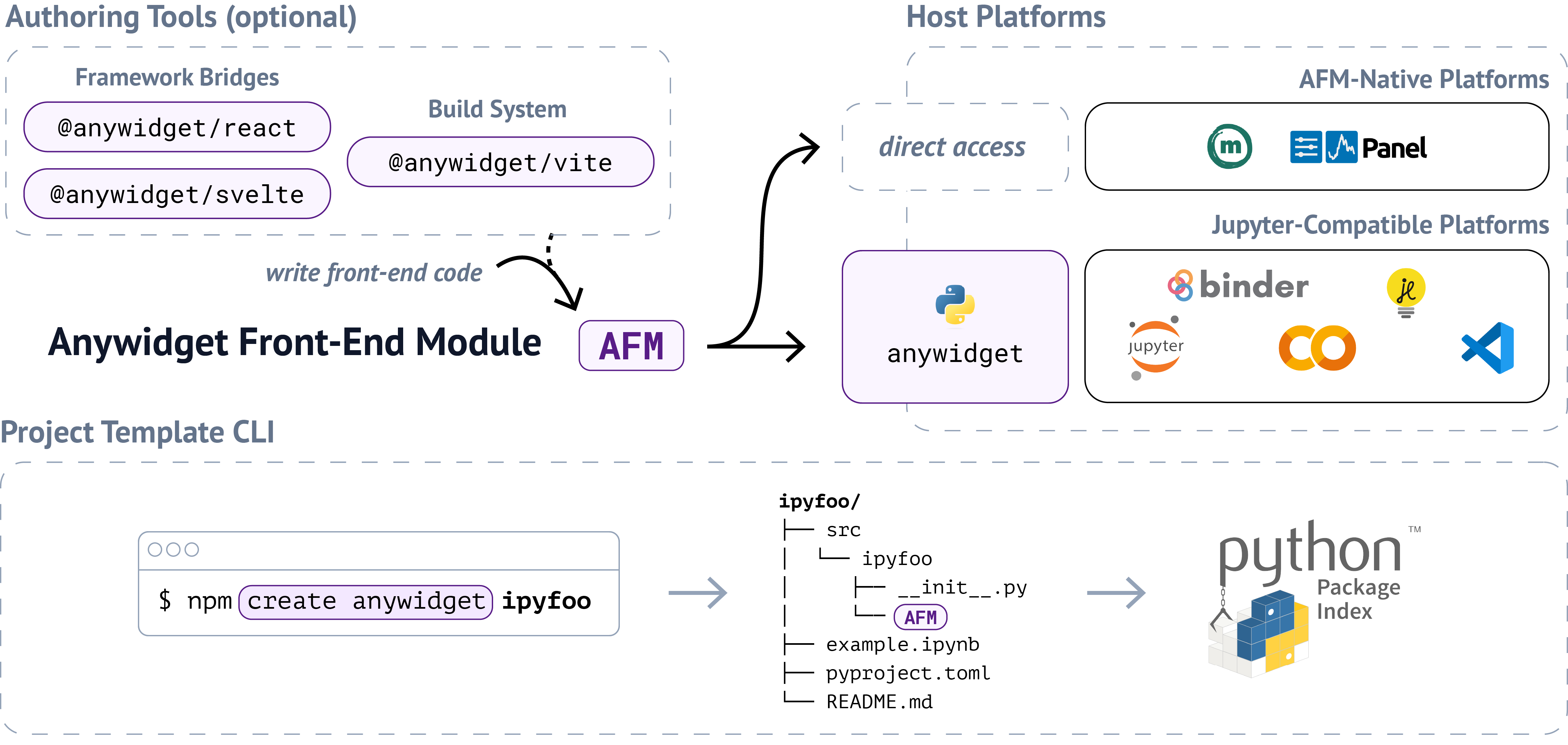 The anywidget project provides a specification and toolset for creating portable web-based widgets for computational notebooks. It defines a standard for front-end widget code using ECMAScript modules and offers tools for authoring, distributing, and executing these modules across Jupyter-compatible platforms (e.g., JupyterLab, Google Colab, VS Code). The project has spurred the creation of many interactive visualization libraries and has been integrated into existing ones. The standard has been embraced by other computational notebooks, web frameworks, and publishing platforms, extending the reach of interactive widgets beyond the Jupyter ecosystem.